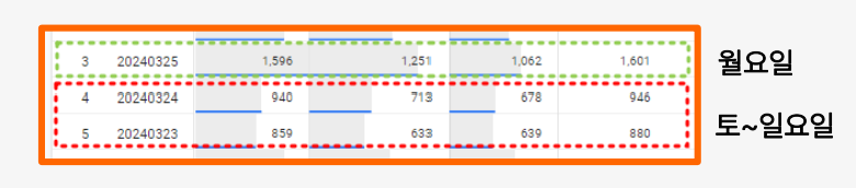바라볼 수 있습니다. 빨간색으로 표기한 구간이 유독 다른 날에 비해서 사용자 수도 적고, 활성